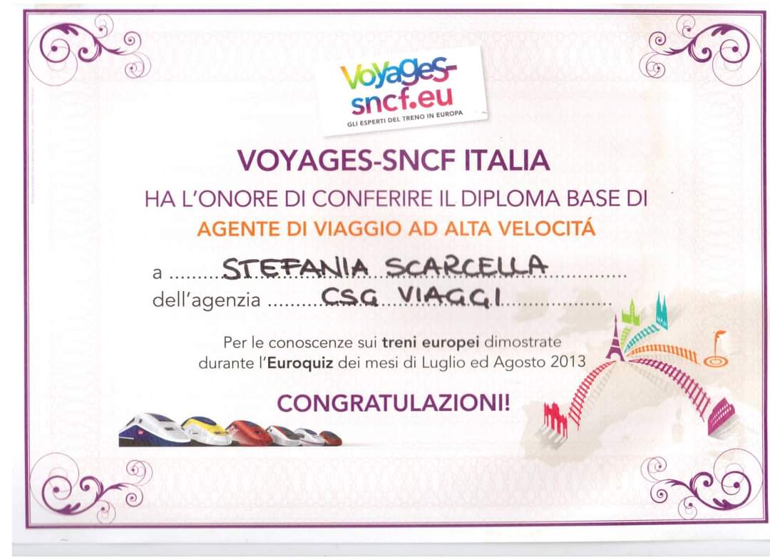 Attestato VOYAGES-SNCF.EU Agente di Viaggio ad Alta Velocità 2013-07 e 2013-08