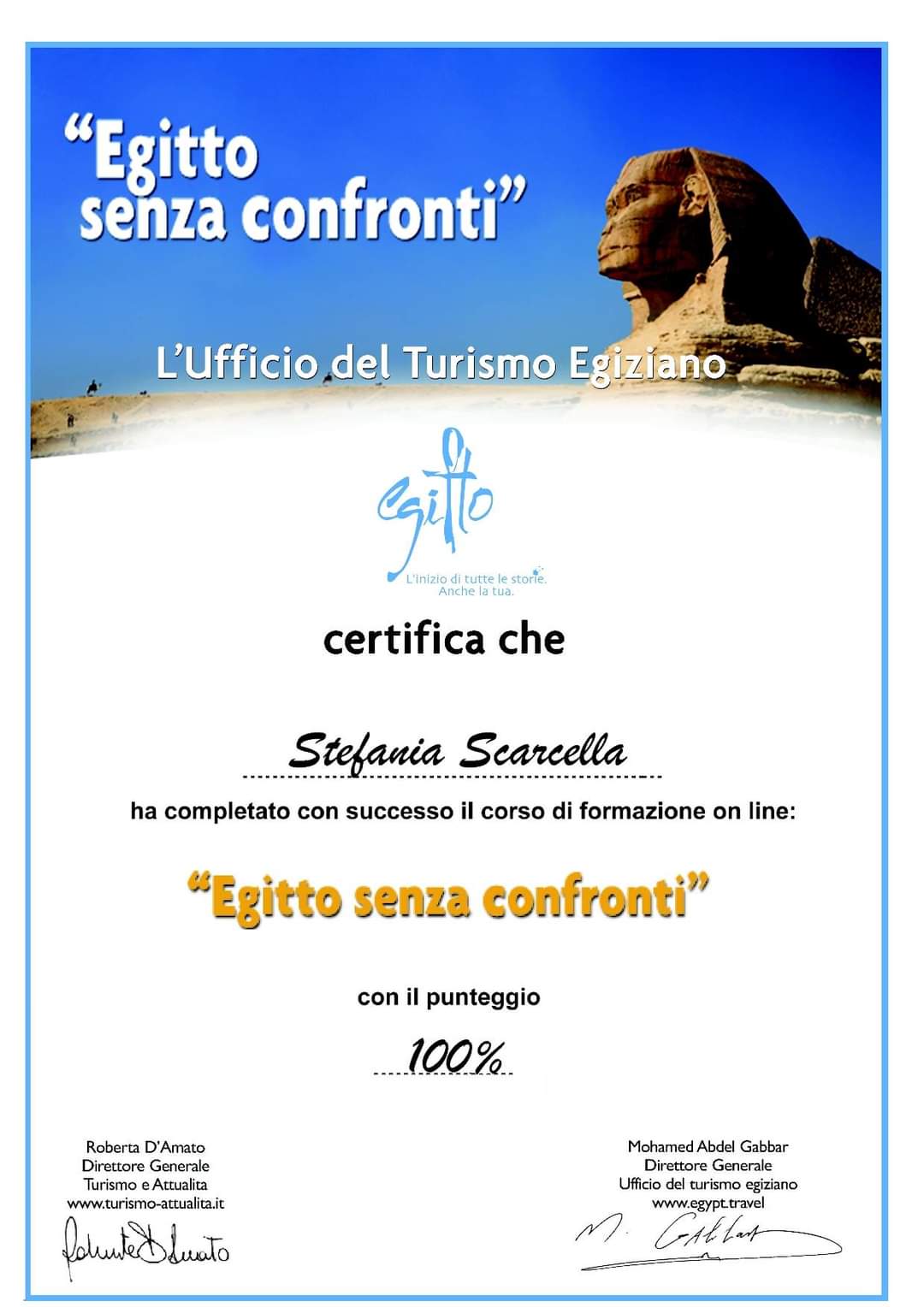 Attestato UFFICIO DEL TURISMO EGIZIANO Egitto Senza Confronti